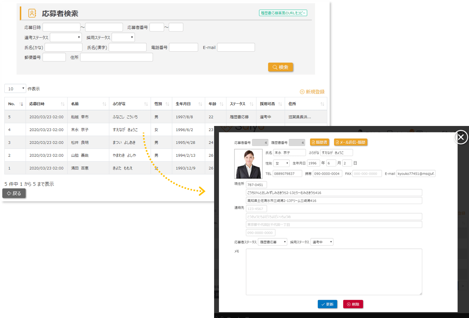 画面の基本構成は履歴書管理と同様で、検索画面で検索、検索一覧から各応募情報を参照するといった構成です。