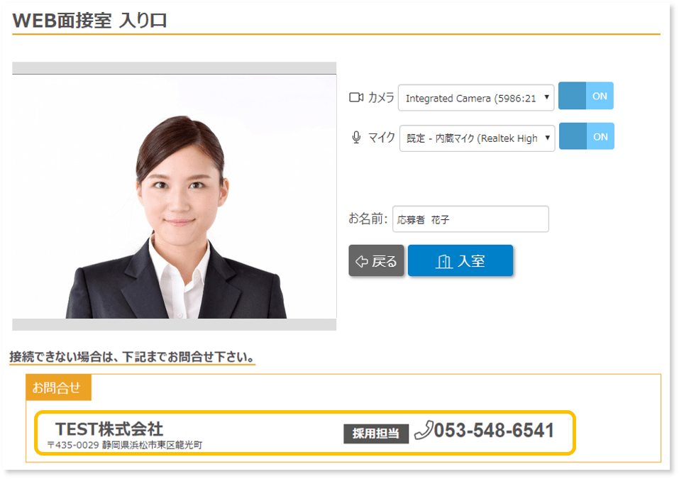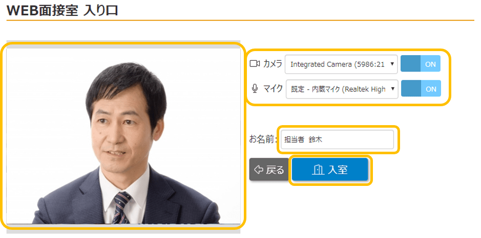 下記の[WEB面接室 入り口]欄にカメラ映像が表示され、カメラとマイクが選択されていることをご確認ください。