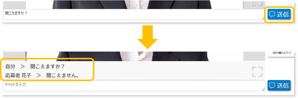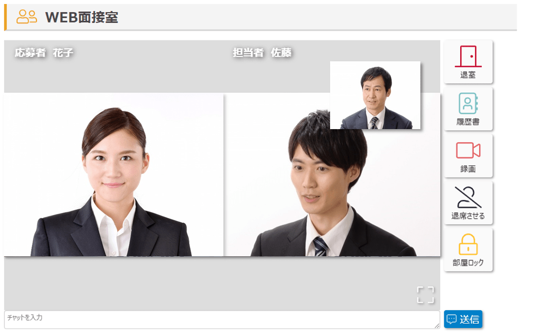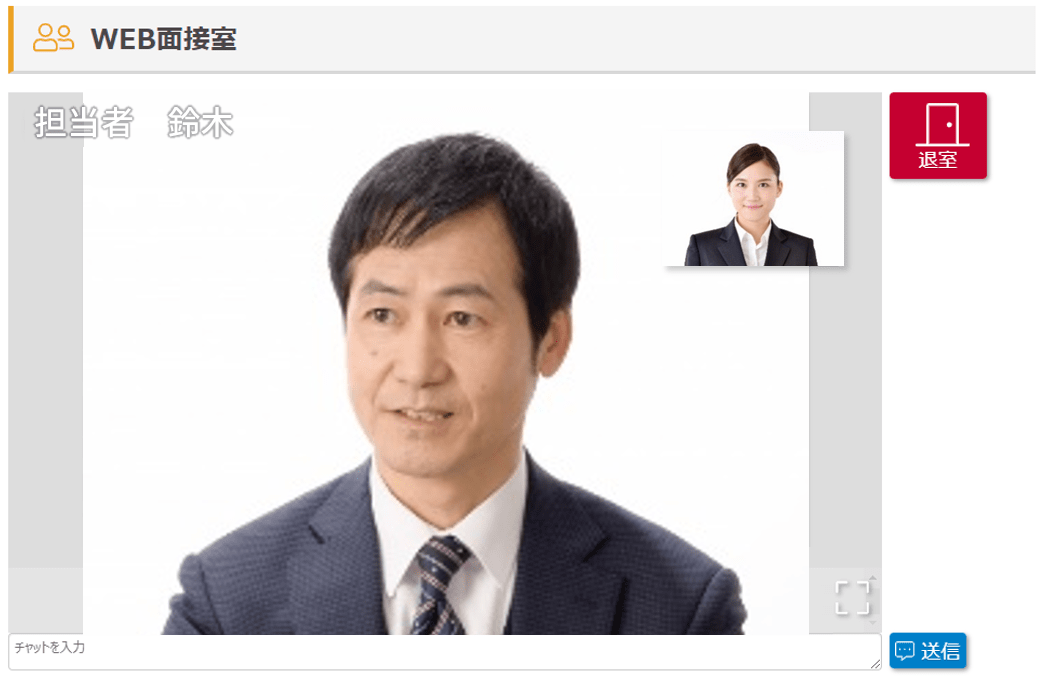 応募者側の画面も、担当者側の画面構成と同様ですが、「退室」「コメント」「表示サイズ切り替え」のみのシンプルな画面となっております。